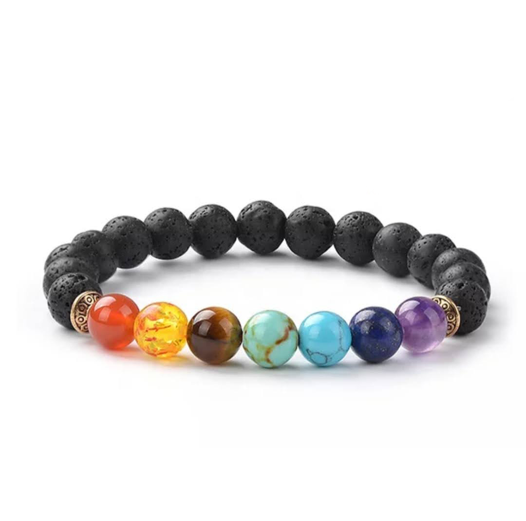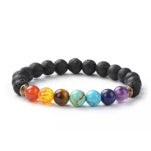 Esta pulsera está formada por piedras naturales seleccionadas específicamente para cada chakra, incluyendo amatista (chakra corona), lapislázuli (chakra tercer hojo), Turquesa (chakra de la garganta), jade verde (chakra corazon) citrino (chakra plexo solar) ojo de tigre (chakra sacro) jaspe rojo (chakra raiz).